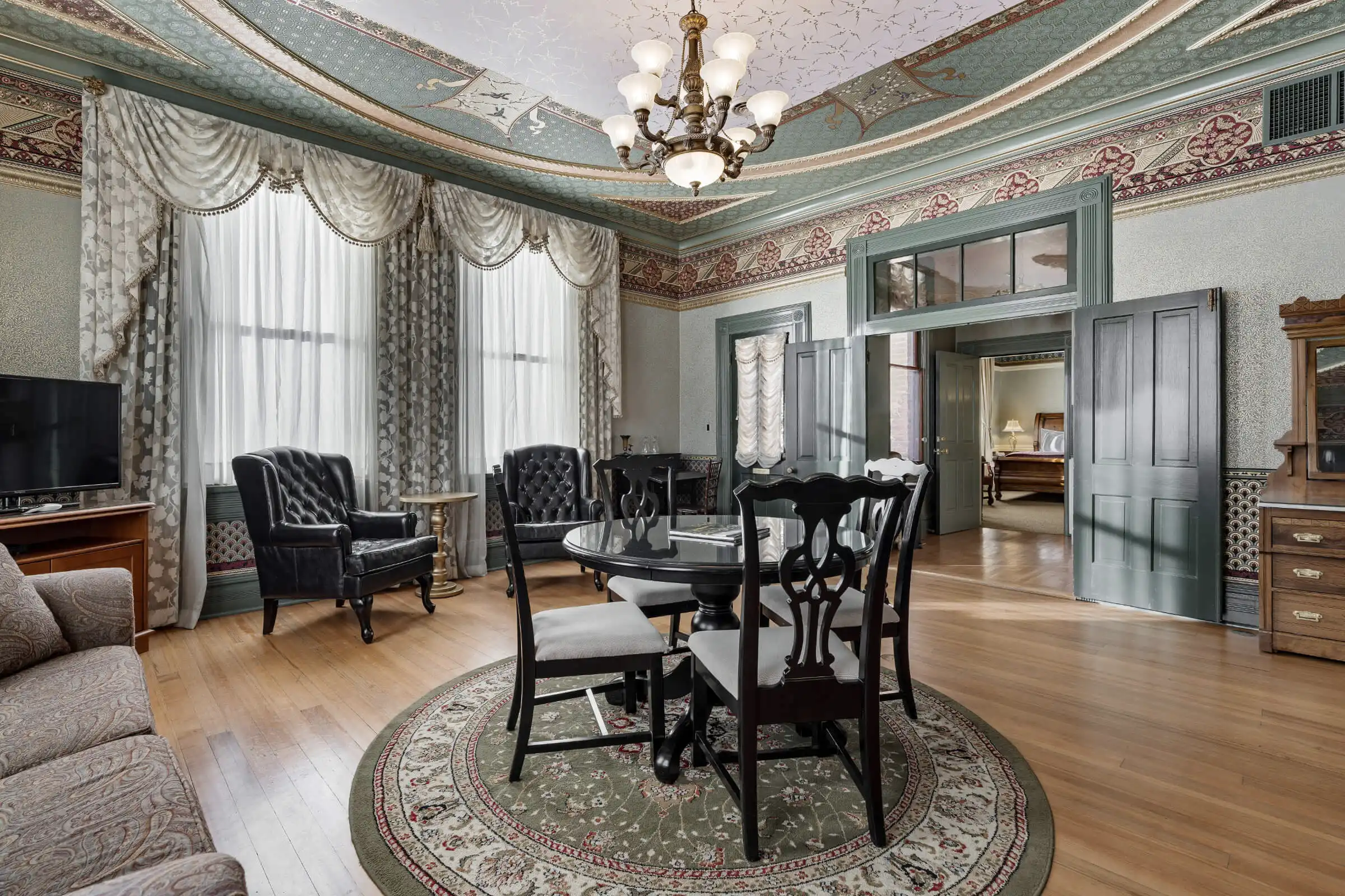 President Theodore Roosevelt’s favorite room during his stay, this expansive suite is the largest at the Beaumont and comfortably sleeps up to six guests. Original windows frame breathtaking views of Mount Abrahams and Box Canyon to the south, with Twin Peaks and historic Main Street to the west. The grand living area features an original (nonfunctional) stone fireplace, flat-screen TV, queen sleeper sofa, writing desk, dining table, and inviting seating. Guests are often captivated by the ornate wallpaper adorning both the walls and ceiling, along with the beautiful period light fixtures.